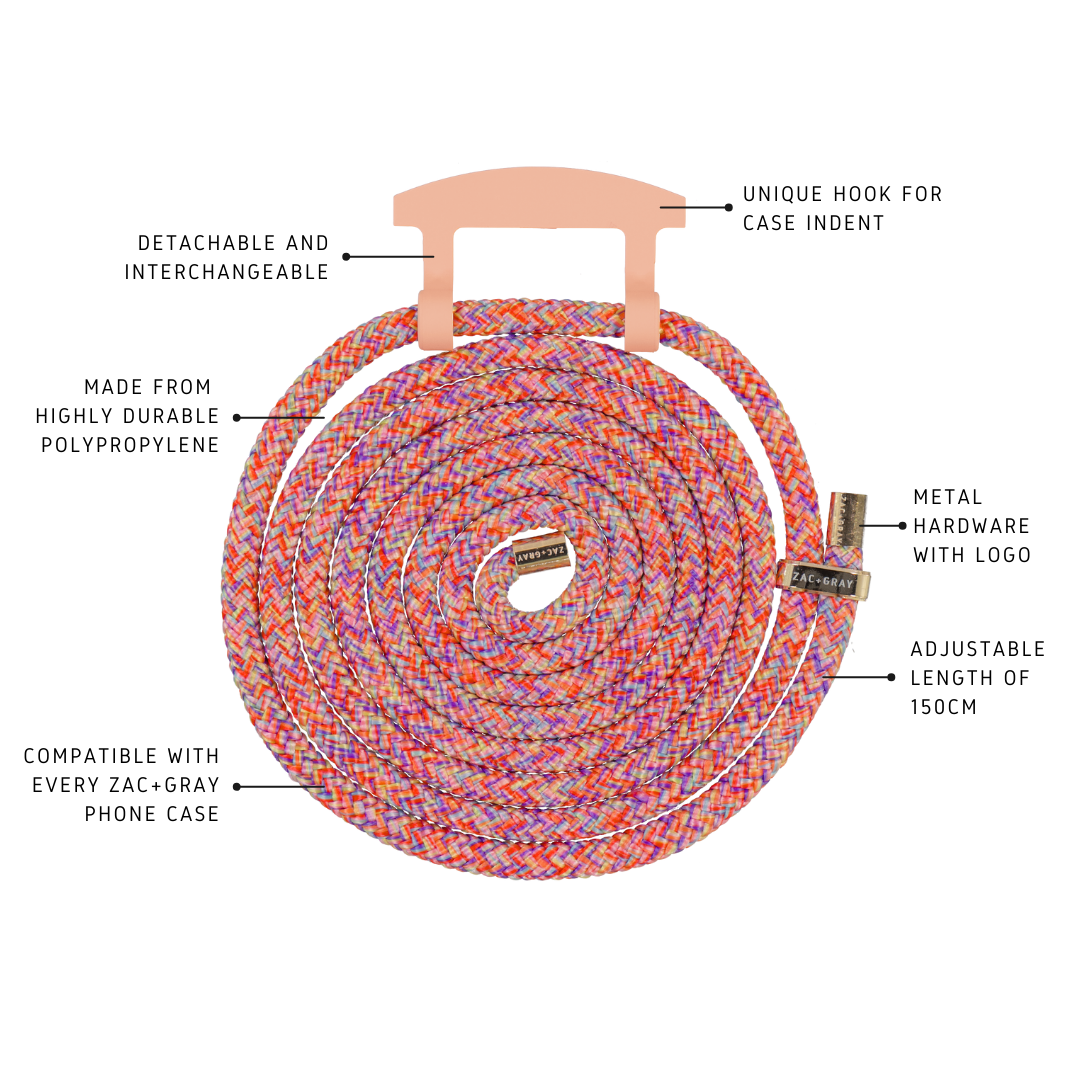 ZAC+GRAY cords are only compatible with ZAC+GRAY crossbody phone cases as they require a unique indent to clip into the phone case. ZAC+GRAY cords cannot be used with any other phone cases.